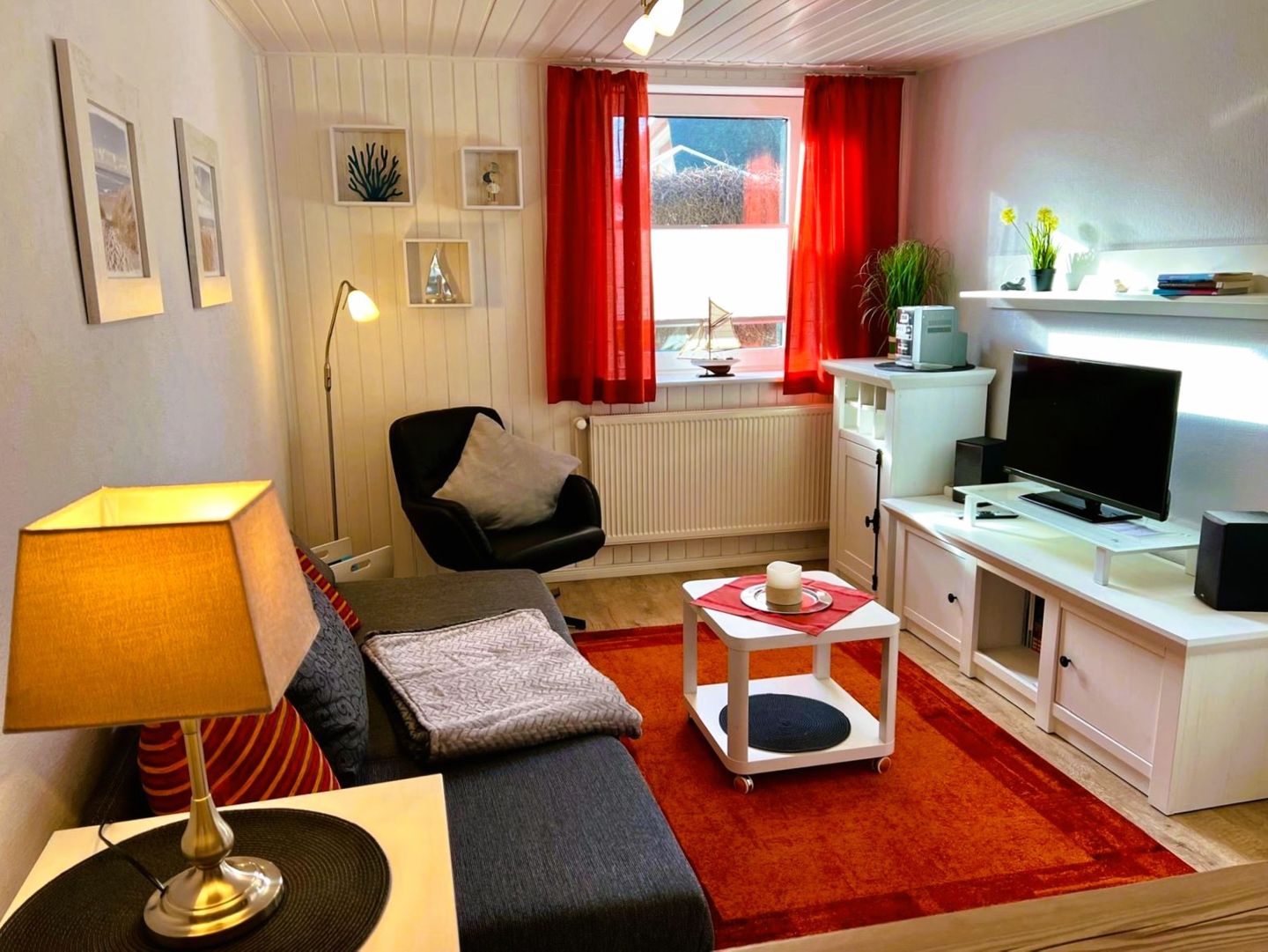 Das Wohnzimmer ist mit einer Couch ausgestattet, SAT-TV, Radio mit CD-Player, Bad mit Dusche/WC, Fön, Handtuchtrockner, Kosmetikspiegel, Schlafzimmer mit Ehebett, Küche mit 2 Induktionskochplatten und Kühlschrank mit Frostfach,Mikrowelle, Kaffeemaschine, Toaster, Wasserkocher